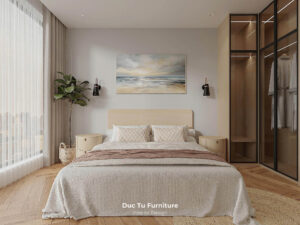 - Phòng ngủ Master: để tạo nên thiết kế ấm cúng, Đức Tú sử dụng vách đầu giường ốp nan gỗ nhẹ nhàng. Đồng thời, đơn vị cũng sử dụng giường lớn, tủ quần áo kịch trần để tăng sức chứa, góc trang điểm nhỏ gọn gần cạnh cửa sổ.