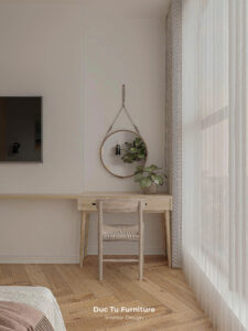 - Góc làm việc/trang điểm: tận dụng các hốc tường hoặc góc cửa sổ để đặt bàn được đo đạc kỹ lưỡng treo tường. Giúp tiết kiệm diện tích sàn mà vẫn đảm bảo đủ ánh sáng tự nhiên.