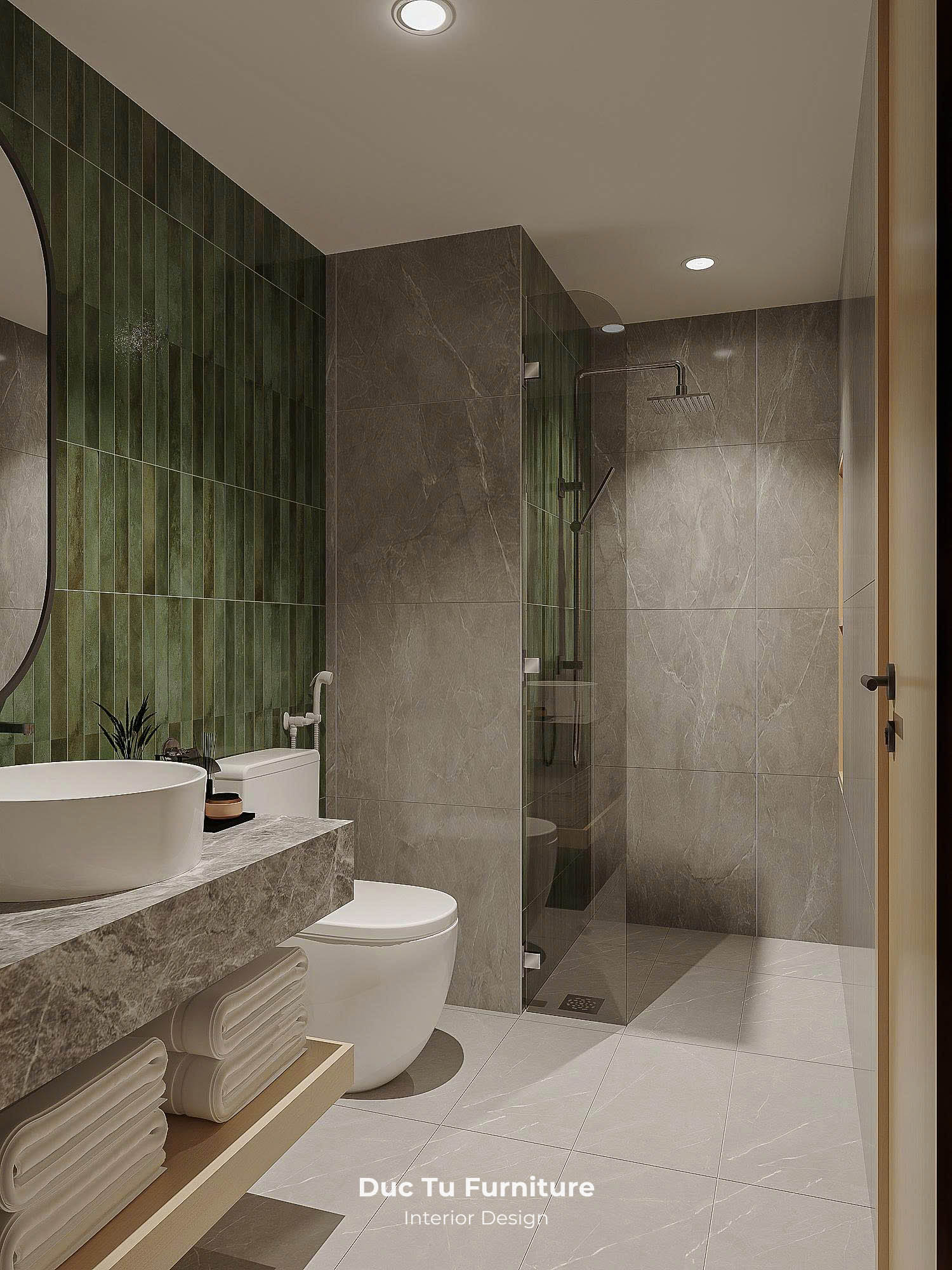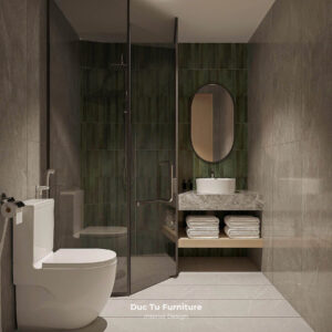 - Toilet thiết kế tinh tế với ốp đá tone màu trung tinh. Kết hợp với thiết kế vách kính tắm đứng. Tạo nên sự sạch sẽ và hiện đại.