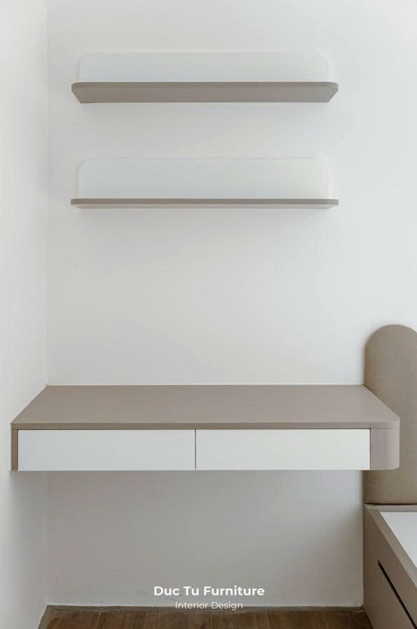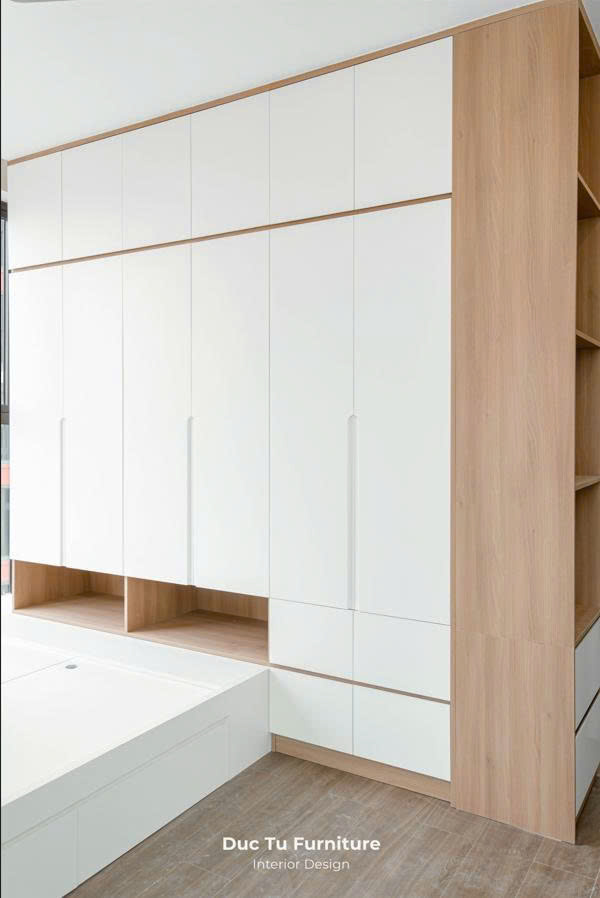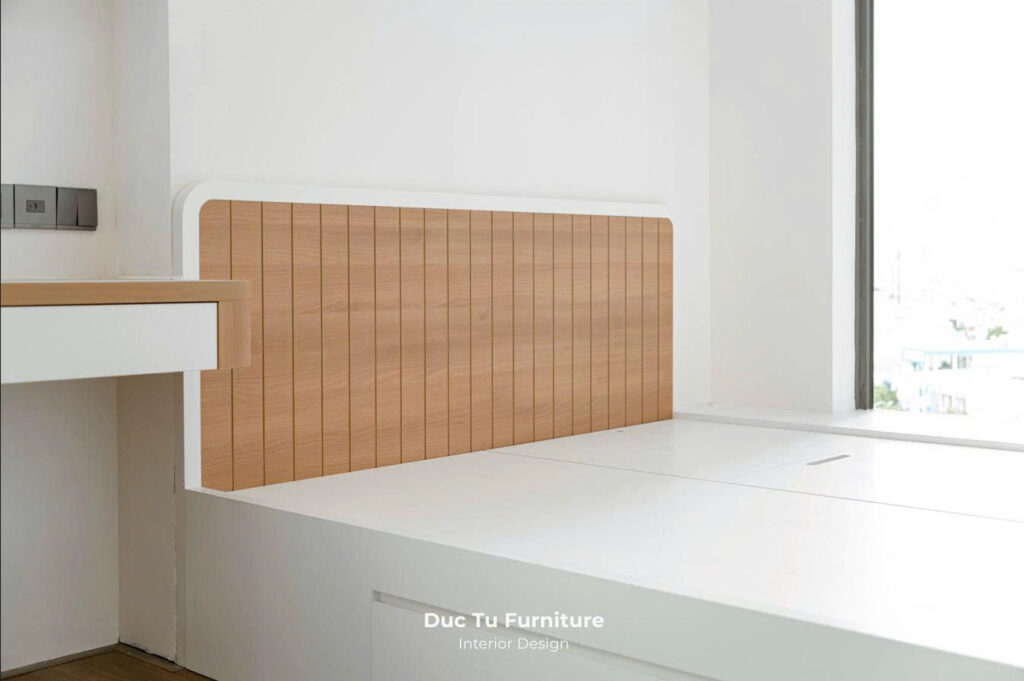 Trong căn hộ có diện tích 69m2 nhưng có 2 phòng ngủ. Việc bố trí đồ dùng nội thất phòng ngủ đòi hỏi sự tinh tế. Để cân bằng giữa công năng và sự thông thoáng, đem đến sự thoải mái cho các thành viên trong gia đình. Giải pháp mà Nội Thất Đức Tú sử dụng chính là sự đồng bộ tuyệt đối về màu sắc. Sự kết hợp với tông gỗ sáng tự nhiên cùng màu tường be sữa. Giúp nới rộng không gian thị giác một cách hiệu quả. 2 sắc thái nhẹ nhàng khi sử dụng với nhau. Mang đến cảm giác dễ chịu nhưng ấm cúng. Đồng thời, còn khiến căn phòng thêm phần rộng rãi và tràn đầy sức sống.
