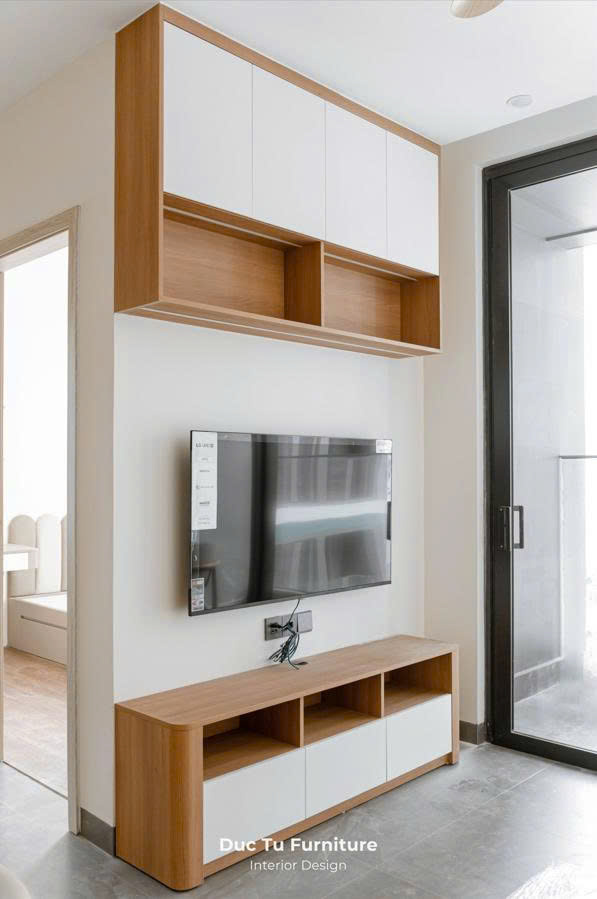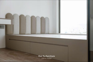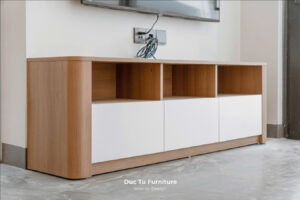 Thay vì sử dụng những đường nét thẳng, thô kệch. Đức Tú Furniture đã khéo léo áp dụng các chi tiết nội thất bo góc mềm mại cho hệ tivi và tủ trang trí. Những đường cong này giúp không gian trở nên thanh thoát, uyển chuyển. Mà còn đảm bảo sự an toàn cho các thành viên gia đình trong quá trình sinh hoạt.