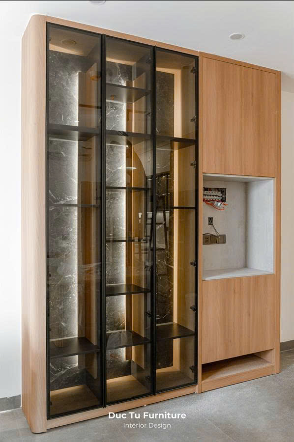 Bước vào căn hộ, không gian phòng khách và phòng bếp đã gây ấn tượng với gia chủ. Chính là hệ tủ trang trí với tủ rượu cánh kính hiện đại. Sự kết hợp tinh tế giữa khung nhôm thanh mảnh, cùng với hệ đèn LED chạy dọc bên trong. Giúp phô diễn vẻ đẹp của những món đồ gia chủ sưu tầm. Nhưng đồng thời cũng tạo nên hiệu ứng thị giác bắt mắt. Biến những khối tủ gỗ thông thành tác phẩm nghệ thuật sang trọng.