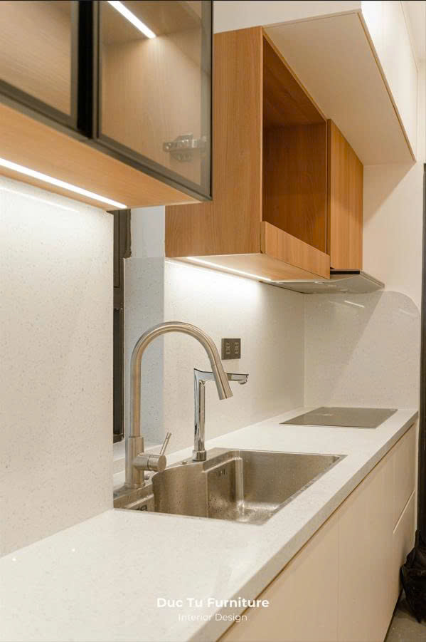 Tiếp vào khu vực bếp, biện pháp tủ bếp kịch trần được các kiến trúc sư Đức Tú tính toán kỹ lưỡng. Điều này vừa giúp che đi những khuyết điểm của toà nhà. Vừa tận dụng tối đa khoang chứa đồ trên cao, tăng không gian lưu trữ. Cách bố trí này không chỉ đem lại sự gọn gàng, ngăn nắp. Mà còn tạo nên sự kết nối cho không gian căn hộ. Giúp tổng thể căn hộ 69m2 giữ được sự thoáng đãng và tiện nghi.