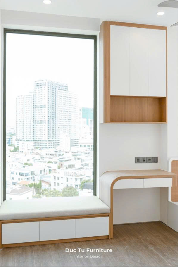 Điểm nhấn của phòng ngủ mà các kiến trúc sư muốn mang đến. Chính là khu vực bàn trang điểm cũng làm bàn làm việc. Chúng được đặt cạnh cửa sổ lớn của căn hộ Panoma. Tận dụng tối đa nguồn ánh sáng tự nhiên. Việc bố trí này không chỉ tạo nên góc làm việc ý tưởng, đầy năng lượng. Mà còn giúp không khí trong phòng được lưu thông. Mang lại cảm giác thoải mái, thư giãn cho chị T sau thời gian làm việc mệt mỏi.