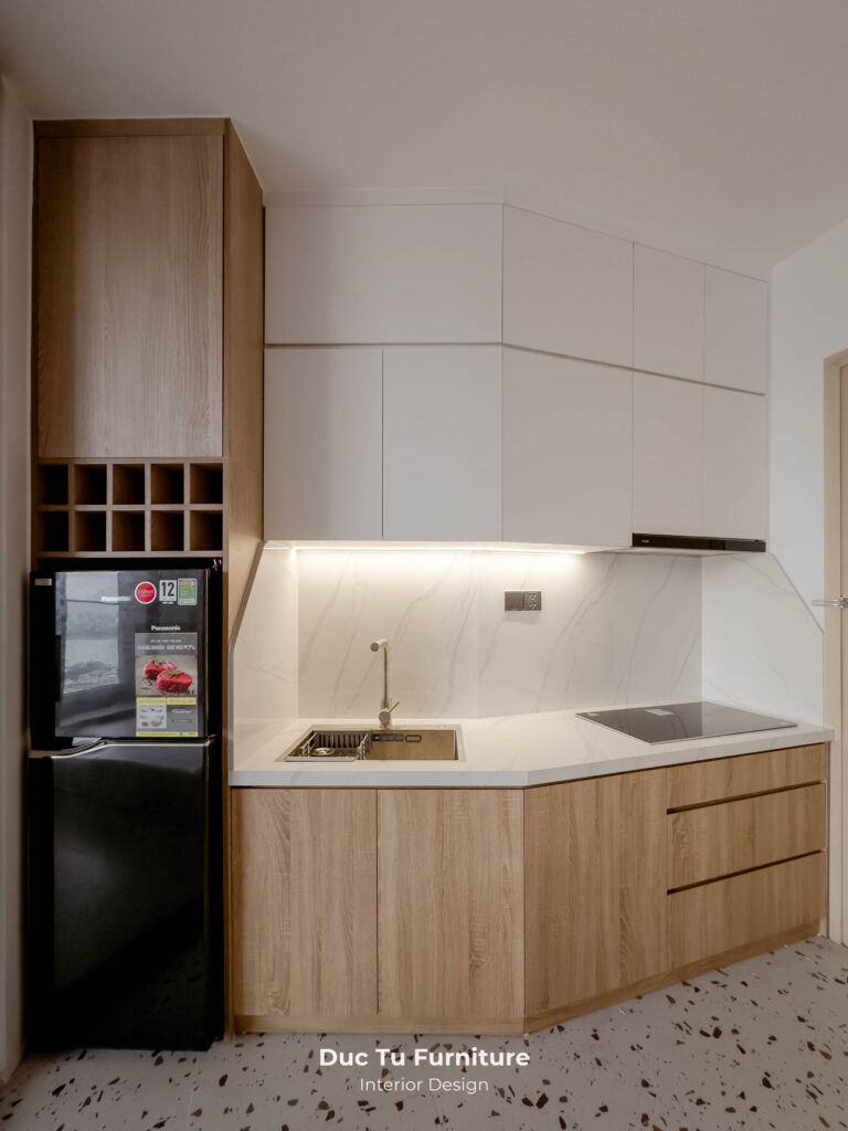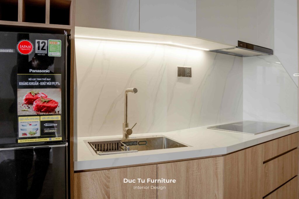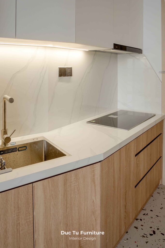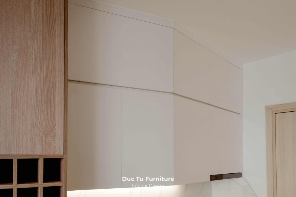 • Tại khu vực bếp, sự chỉnh chu được thể hiện với hệ tủ kịch trần. Giúp tối ưu hoá không gian lưu trữ, sẵn sàng cho việc sắm sửa, bày biện cho những ngày Tết sắp tới. Độ phẳng mịn của bề mặt gỗ kết hợp với các thiết bị âm tủ chắc chắn. Tạo nên tổng thể vô cùng liền mạch và đồng bộ.