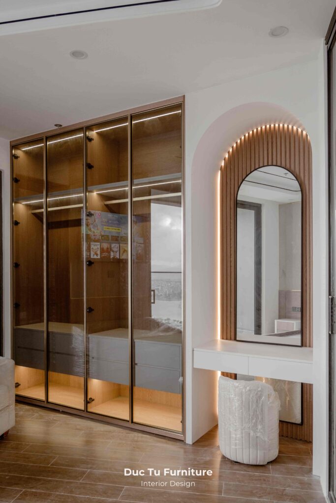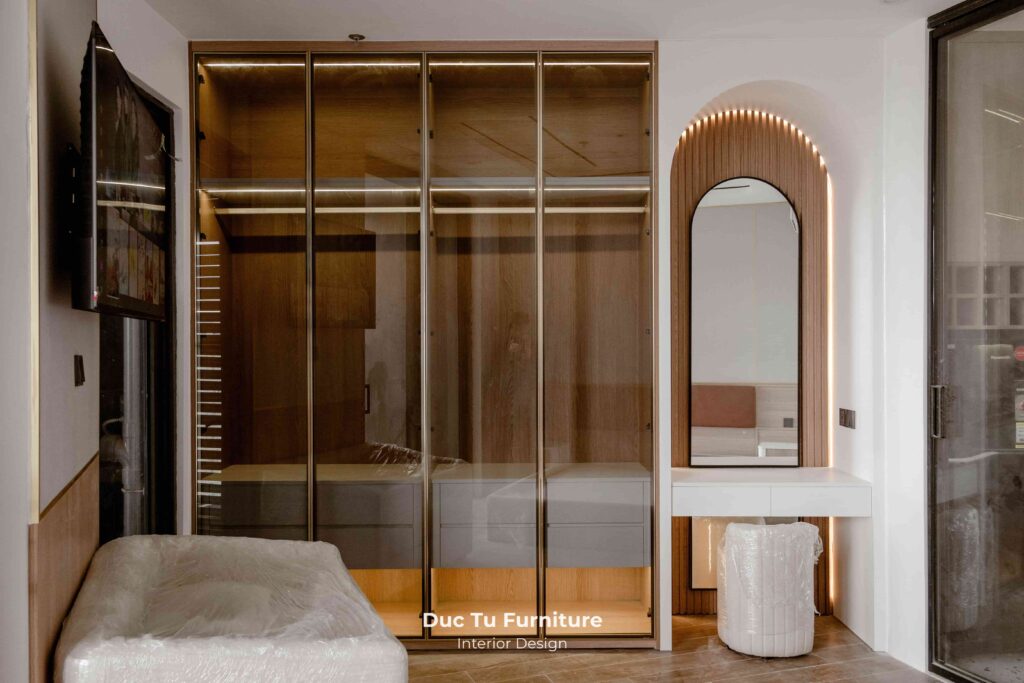 • Hệ tủ áo cánh kính màu trà sang trọng, kết hợp khung nhôm định hình được lắp đặt chính xác.