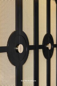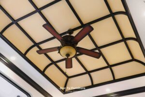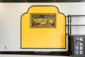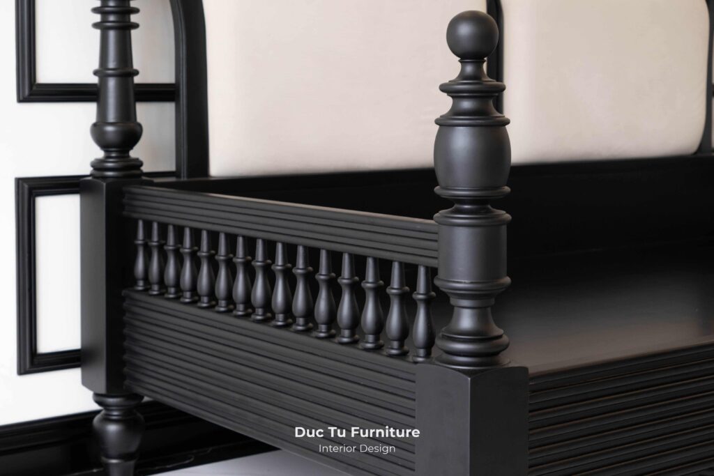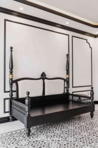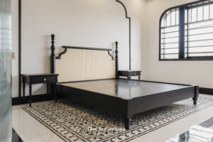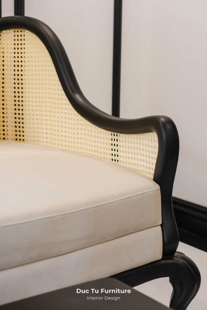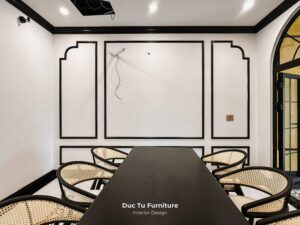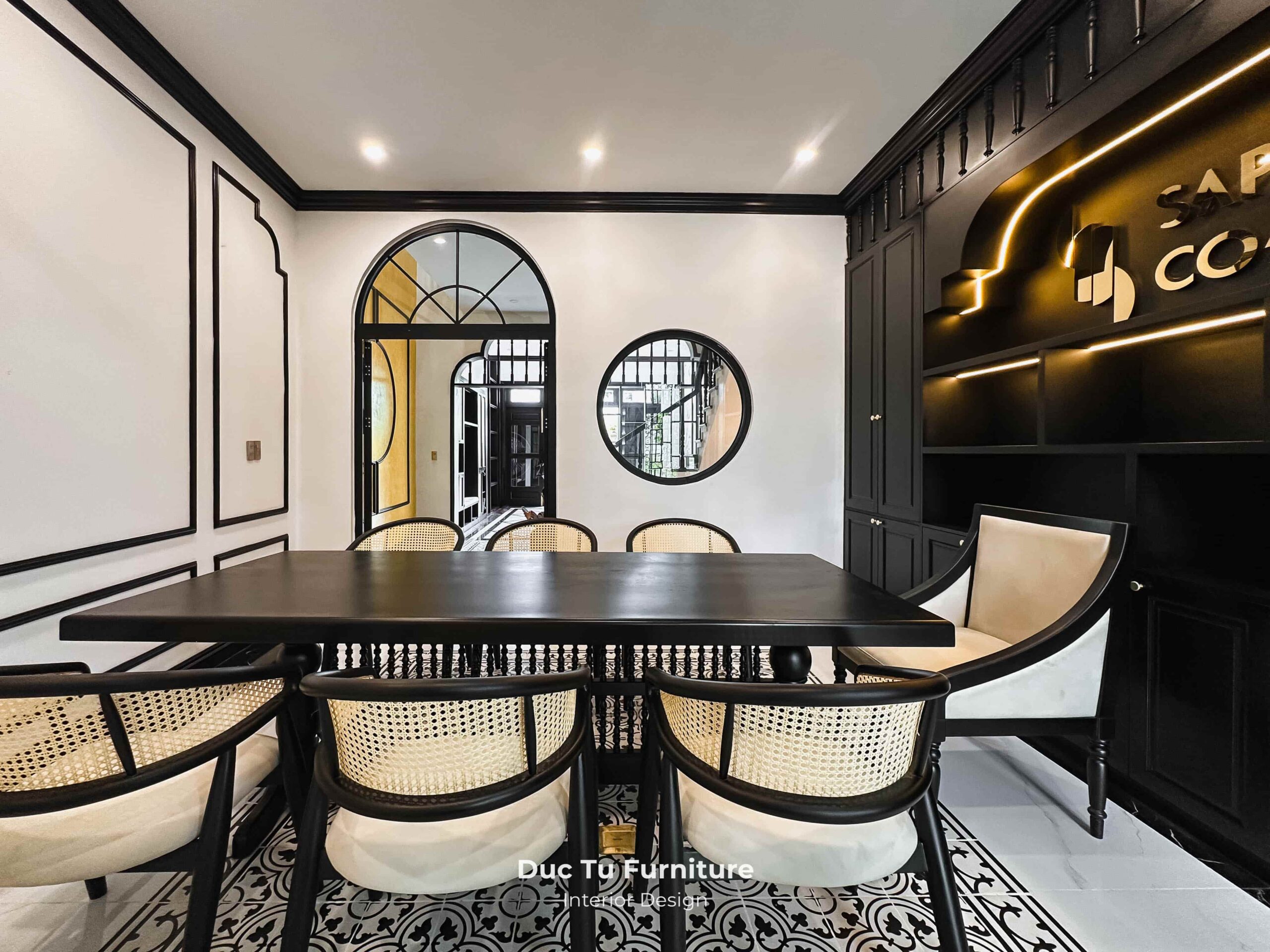 Trong kiến trúc nhà phố, việc để nguyên các chi tiết cầu kỳ của dinh thự Indochine xưa cũ dễ khiến không gian trở nên ngột ngạt và nặng nề. Thấu hiểu được điều này, Nội thất Đức Tú đã tìm ra một giải pháp cốt lõi chính là: Nghệ thuật tiết chế hoa văn phức tạp. Đơn vị chủ động lược bỏ những mảng chạm trổ rườm rà trên nội thất gỗ. Thay vào đó là những đường nét phẳng phiu, thanh mảnh. Nhưng vẫn giữ được hệ khuôn đặc trưng của phong cách Đông Dương.