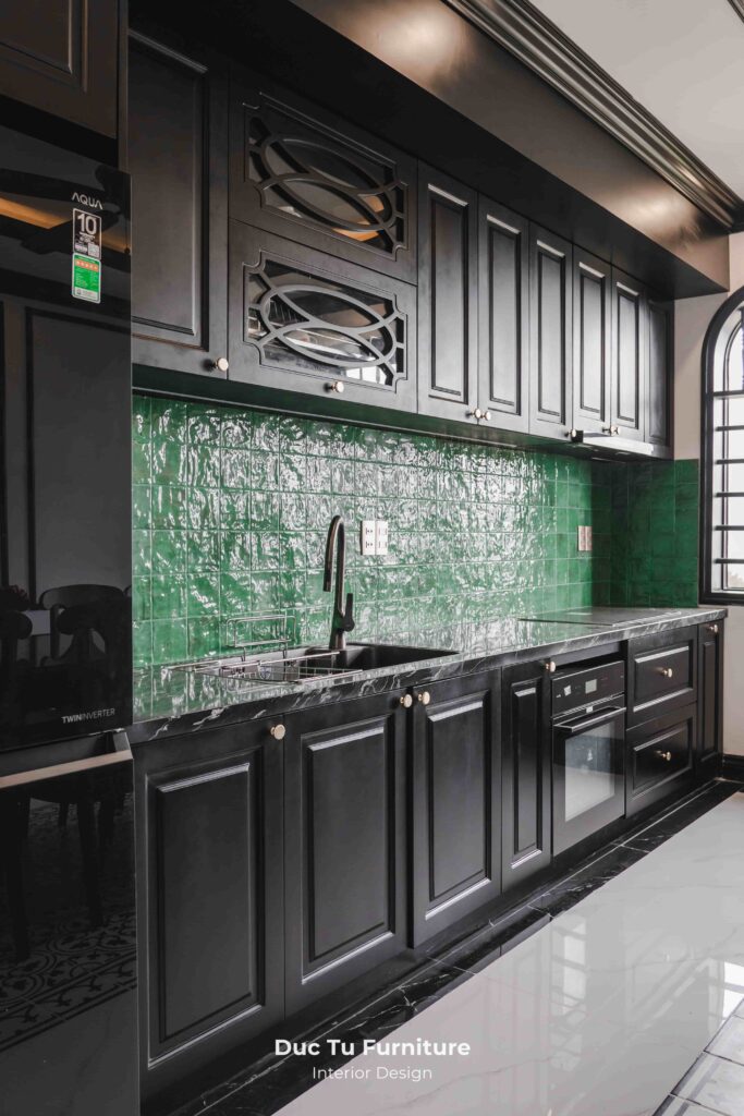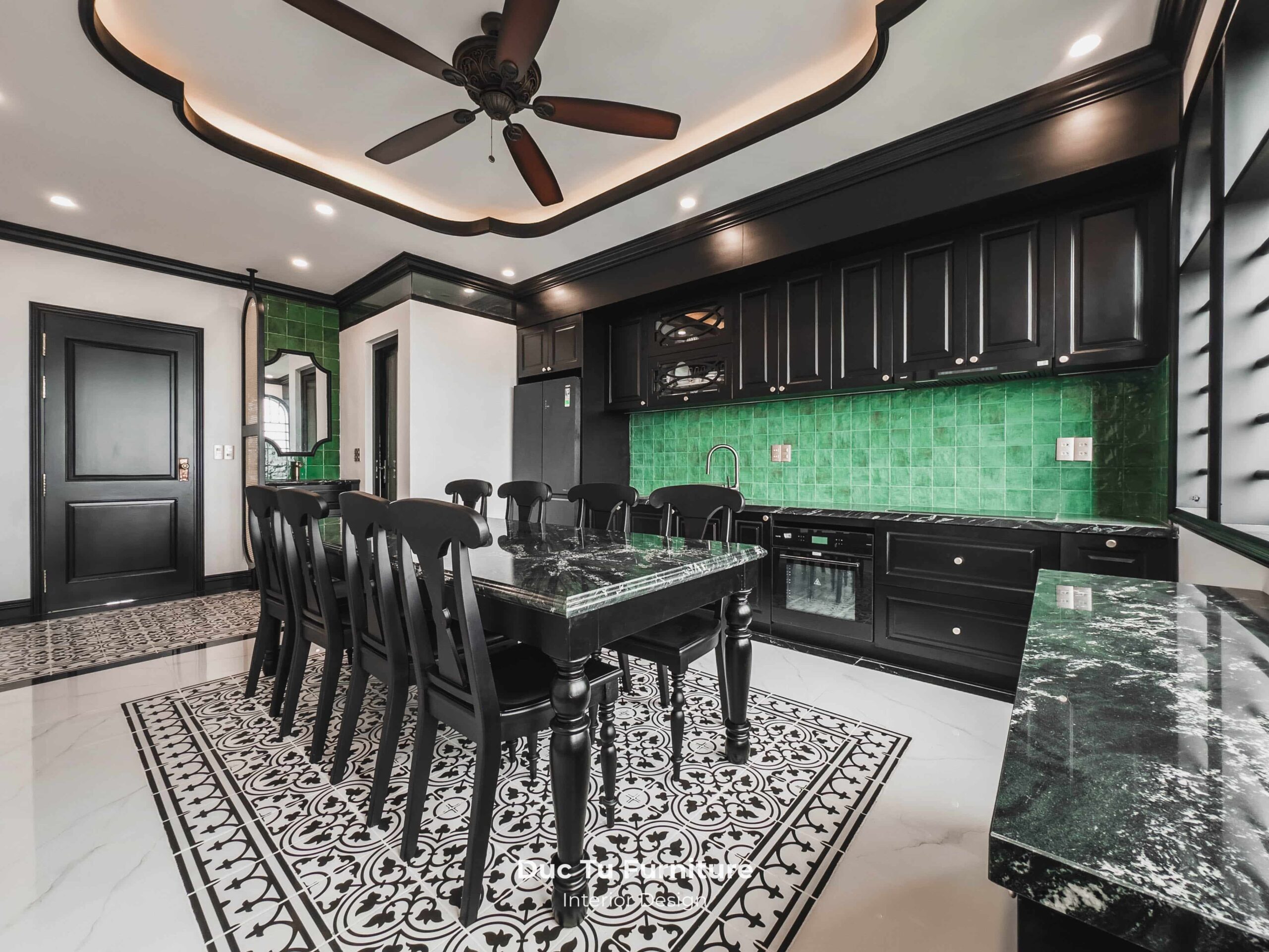Căn bếp là sự giao thoa hoàn hảo giữa thiết bị hiện đại và nét xưa của gạch bông truyền thống. Cách bố trí thông minh giúp khu vực nấu nướng vừa tối ưu công năng. Vừa mang lại cảm giác gần gũi trong mỗi bữa cơm gia đình.