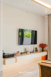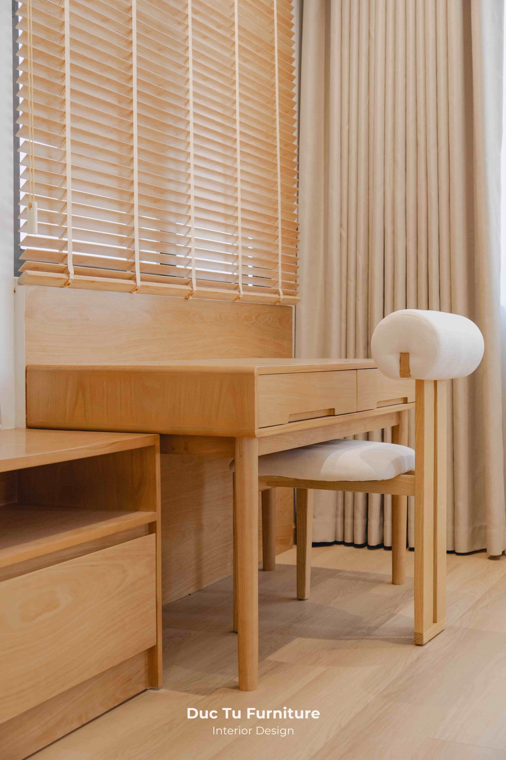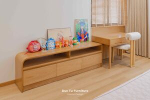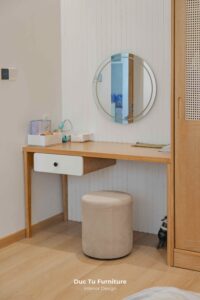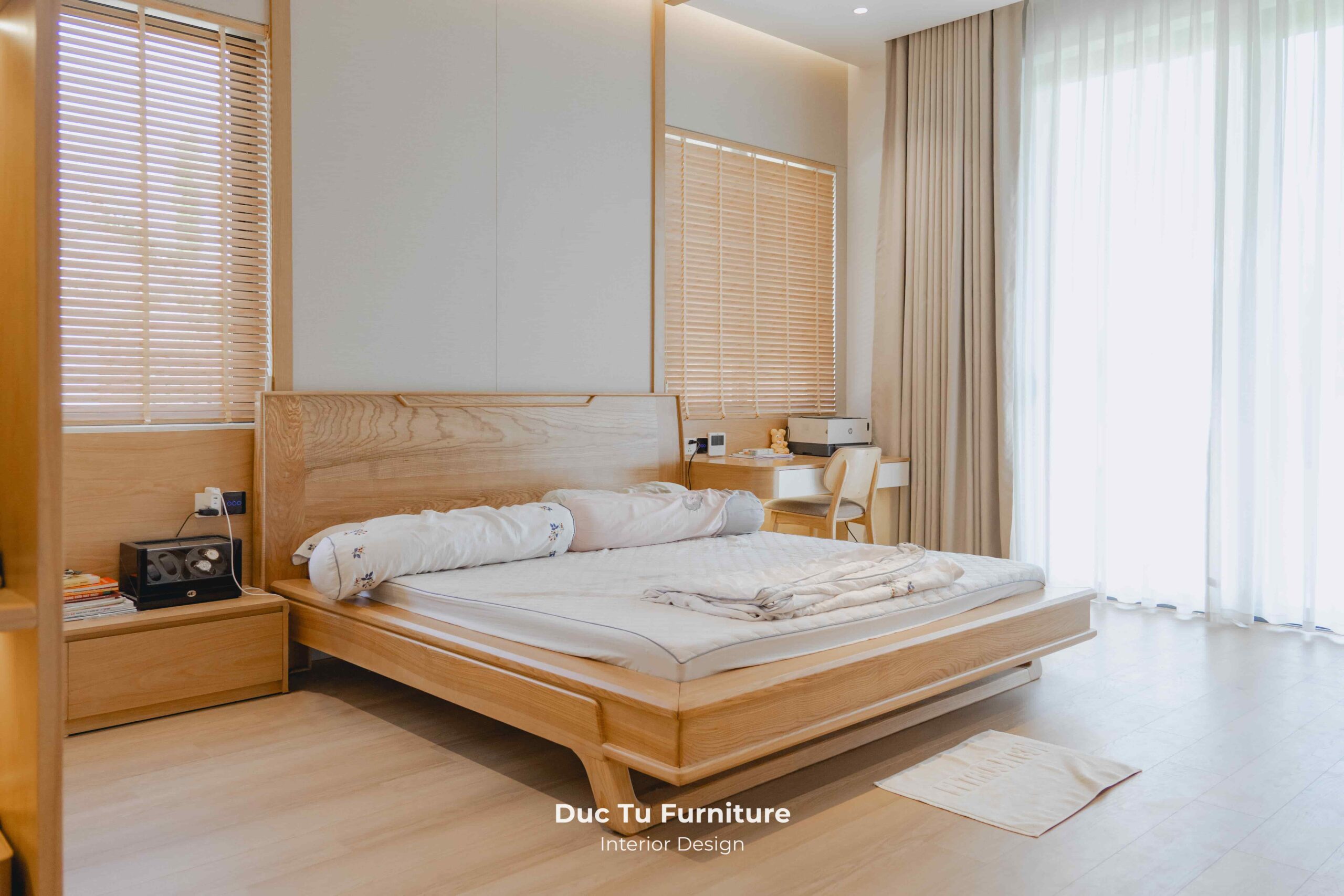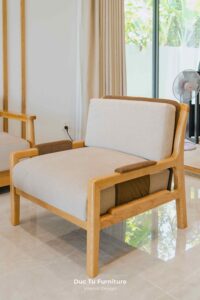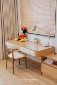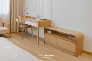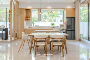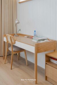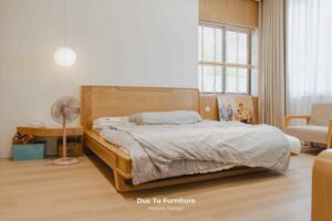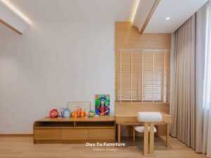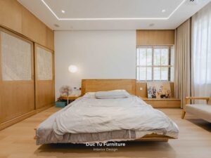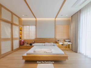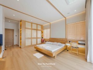 Bên cạnh những ưu điểm về độ bền vượt trội theo năm tháng, lý do khiến Anh Minh – gia chủ villa ưu ái gỗ tự nhiên chính là khả năng truyền tải trọn vẹn tinh thần của phong cách Japandi. Đây là sự kết hợp hoàn mỹ giữa nét tĩnh lặng, tối giản của Nhật Bản và sự tiện dụng của Bắc Âu. Chất liệu gỗ tự nhiên tại Đức Tú Furniture với sắc thái ấm áp và hệ vân gỗ độc bản. Chính là yếu tố then chốt tạo nên cảm giác mộc mạc nhưng vẫn cực kỳ đẳng cấp.