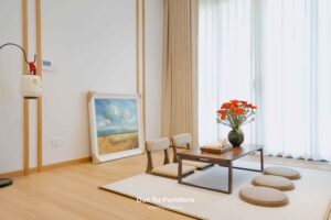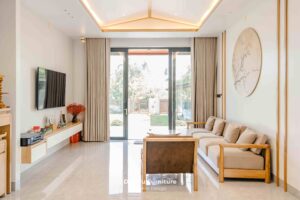 Trong không gian villa, gỗ tự nhiên không chỉ đóng vai trò là vật liệu nội thất. Mà còn là nhịp cầu kết nối con người với thiên nhiên. Những đường nét thiết kế gọn gàng, bề mặt gỗ được xử lý mịn màng. Giúp loại bỏ sự nặng nề, thay vào đó là một bầu không khí thư thái và bình yên. Lựa chọn gỗ tự nhiên cho phong cách Japandi không chỉ giúp công trình duy trì cấu trúc ổn định. Hạn chế cong vênh sau nhiều năm sử dụng. Đồng thời khẳng định gu thẩm mỹ tinh tế của gia chủ.