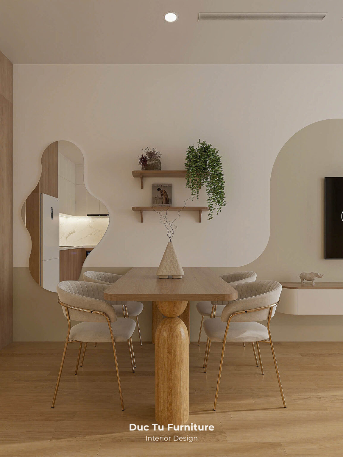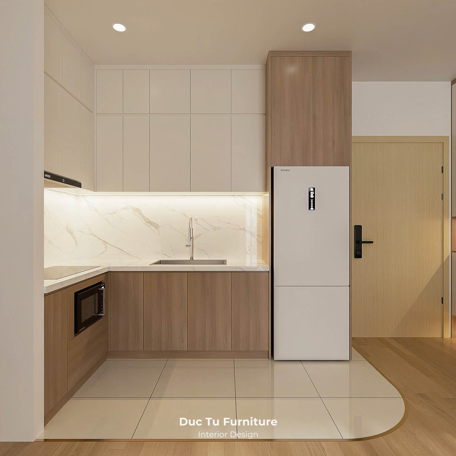 Với thiết kế mở, liên thông phòng khách và phòng bếp. Khu vực bếp cần sự gọn gàng, nên ưu tiên kiểu bếp chữ L hoặc chữ I để tối ưu hóa tam giác công năng giữa bồn rửa – bếp – tủ lạnh. Ngoài ra, để giải quyết bài toán lưu trữ, kiến trúc sư sẽ sử dụng hệ tủ bếp cao kịch trần. Giúp cất giữ gọn gàng nhiều vật dụng trong nhà bếp. Bên cạnh đó, những mẫu bàn ăn nhỏ gọn chính là sự lựa chọn tối ưu. Đảm bảo công năng sử dụng nhưng cũng thuận tiện khi di chuyển cần thiết.