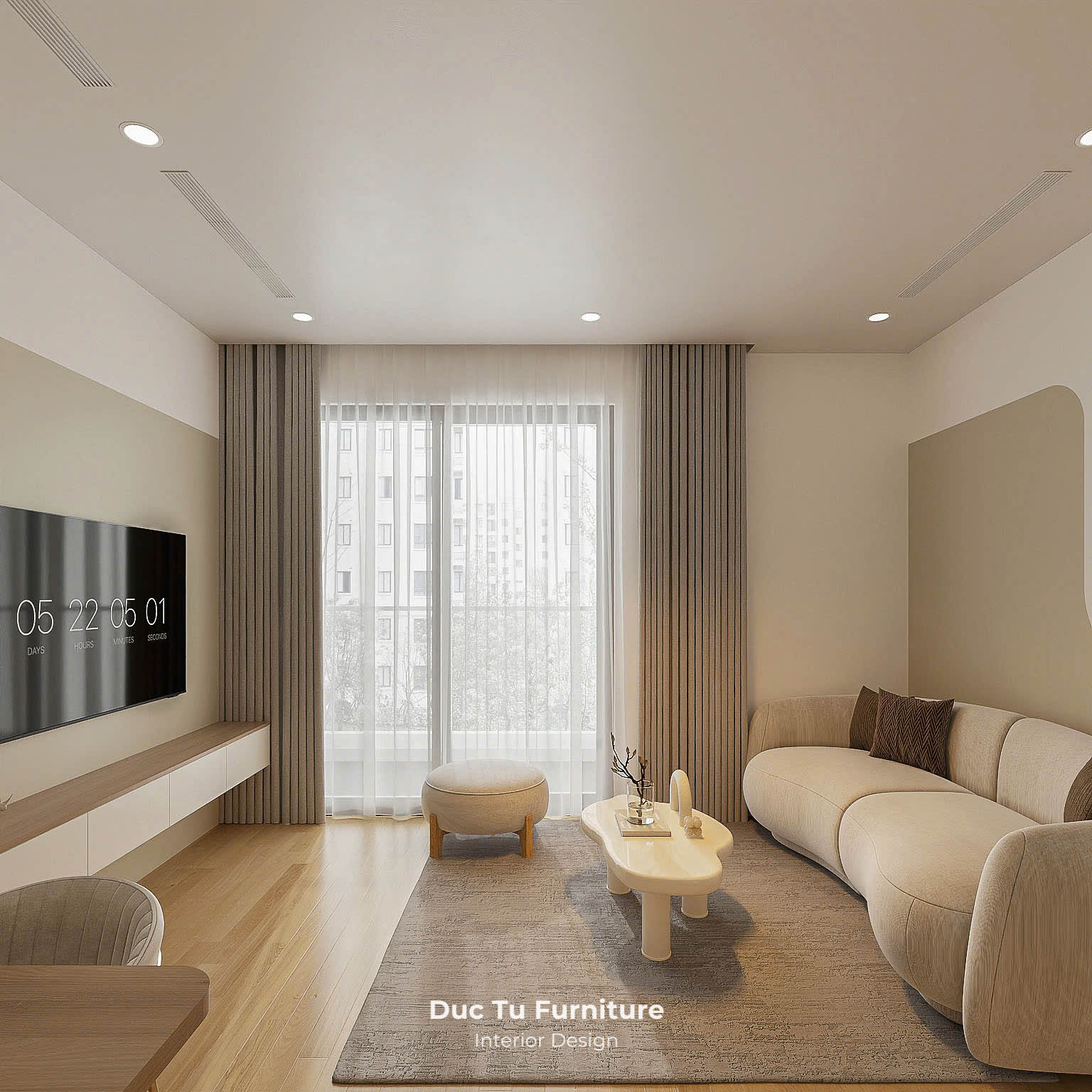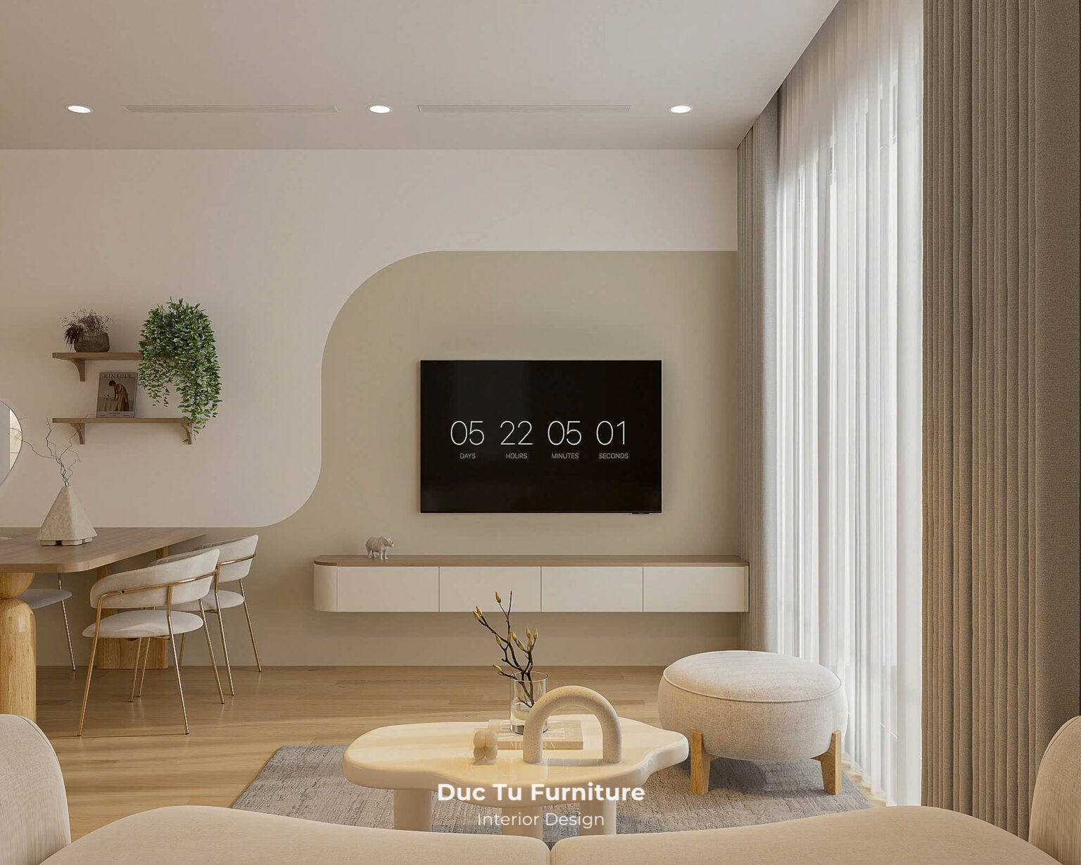 Phòng khách được xem là bộ mặt đại diện cho căn hộ. Nơi đón nhận ánh sáng tự nhiên từ ban công rộng rãi thoáng mát. Để giúp tổ ấm của bạn có thể đón nhận nhiều ánh sáng và gió trời tự nhiên. Bạn có thể sử dụng những mẫu sofa nhỏ gọn với chân cao thanh mảnh. Tại cảm giác sàn nhà rộng hơn. Không sử dụng những hệ tủ cồng kềnh, bạn có thể tham khảo kệ tivi treo tường. Giúp giải phóng diện tích mặt sàn. Đặc biệt, việc sử dụng bảng màu sáng như trắng, kem, ghi nhạt làm màu chủ đạo. Giúp mở rộng thị giác mà còn tôn lên vẻ sang trọng, hiện đại vốn có của dự án.