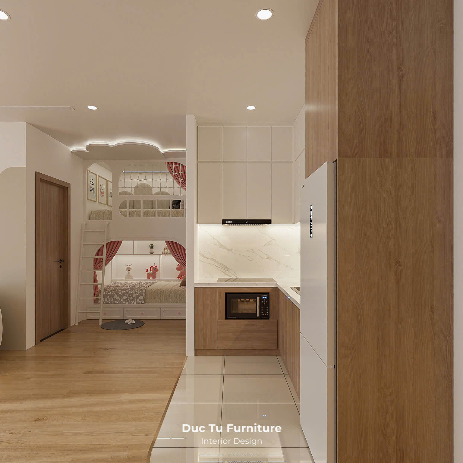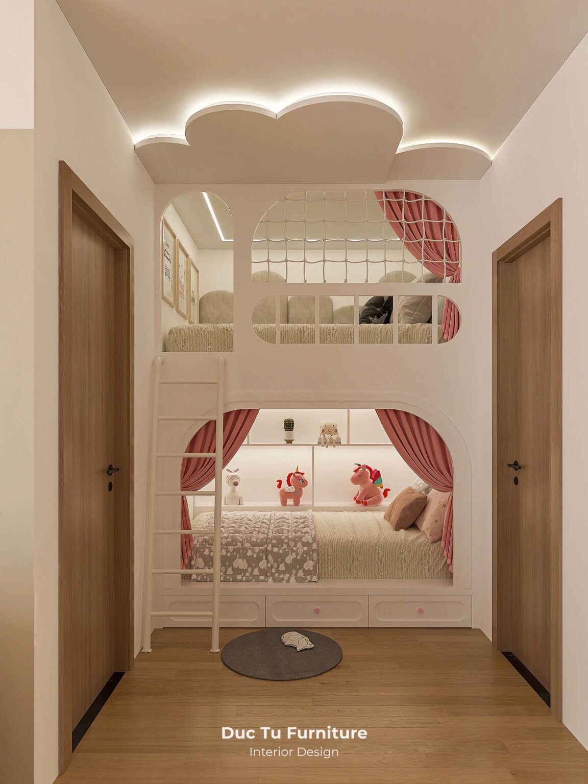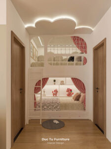 Không gian “1+” được tận dụng như một phòng ngủ nhỏ dành riêng cho bé. Giúp trẻ có góc sinh hoạt riêng mà không cần chia thêm phòng kín. Giải pháp giường tầng tích hợp lưu trữ giúp tối ưu theo chiều cao. Đồng thời tạo cảm giác như một thế giới riêng biệt cho trẻ. Bên cạnh đó, việc sử dụng rèm mềm hoặc vách ngăn nhẹ. Giúp tăng sự riêng tư nhưng vẫn giữ được sự thông thoáng cho toàn bộ căn hộ.